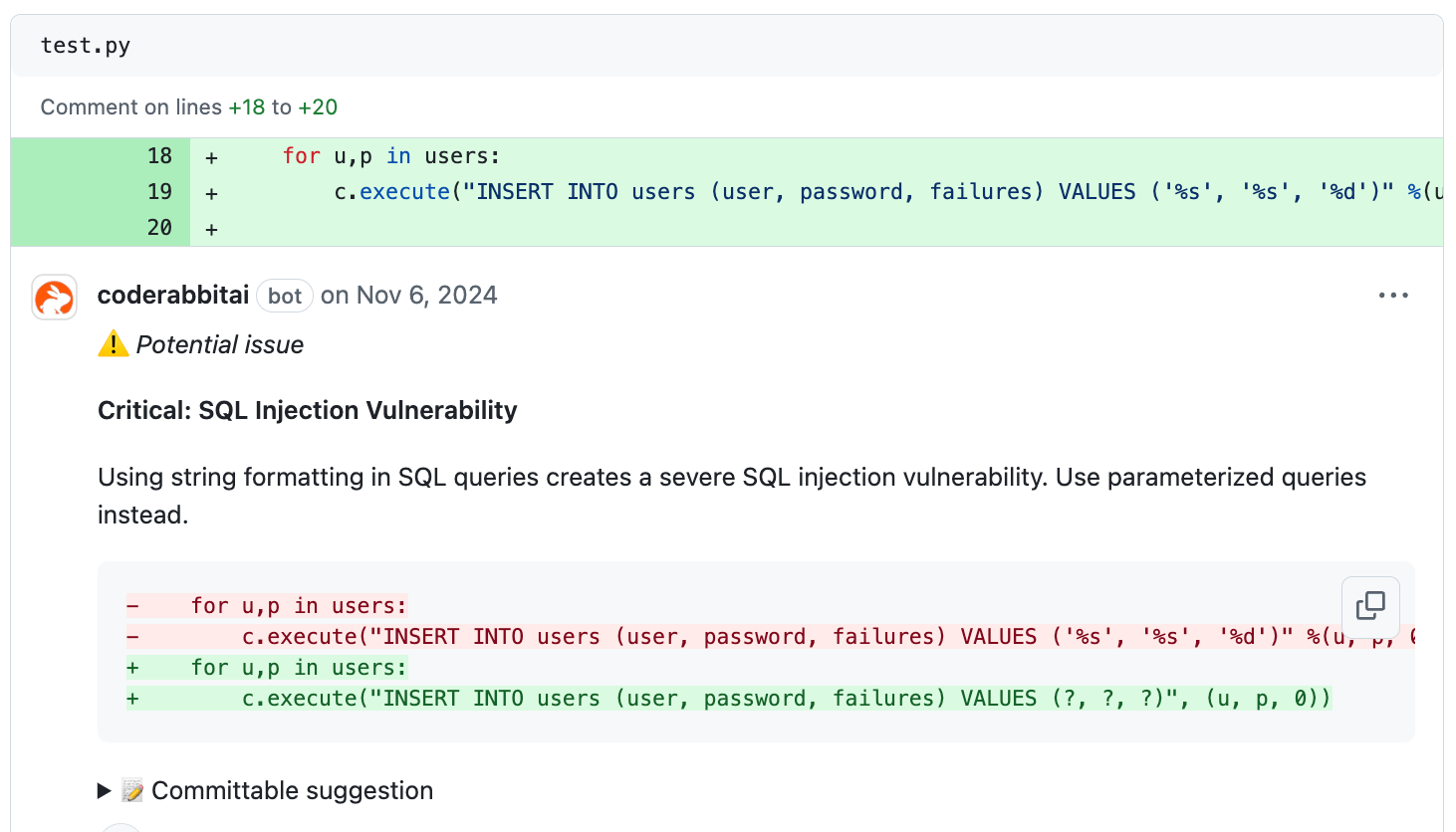 Example as you mentioned, logical or functional bugs, race conditions or SQL memory leaks, injection vulnerabilities, error handling, refactors that would make your code more maintainable, even exposed credentials which you’d be surprised how common they can be especially in a vibe coding era. We encounter these all the time.