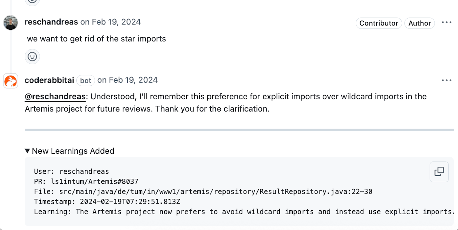 Users can give feedback to CodeRabbit and that feedback is recorded and used in all subsequent reviews. You can simply chat with it in your PR like you would chat with a human reviewer. Ask questions, provide feedback, counter-question its assumptions or delve deeper into why certain review comments were made. All of these are recorded as learnings. For example: the AI might recommend that if you are importing many different classes, maybe use a wildcard import instead. But perhaps you don’t want to do wildcard imports, in that case you can simply chat with it and let it know your preference and it won’t recommend wildcard imports in future.